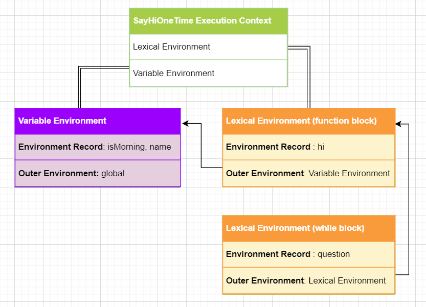 그리고 sayHelloOneTime 에는 while 블록이 있다. while 블록은 다시 Lexical Environment 를 정의하며, Environment Record 에 let 으로 선언된 question 의 정보를 매핑한다. 또 외부 환경 참조 값으로 sayHelloOneTime 의 Lexical Environment 를 가진다.