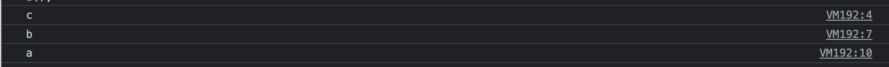 실행 순서는 c(), b(), a() 입니다. 그 결과 콘솔 창에는 c, b, a 순으로 출력됩니다.