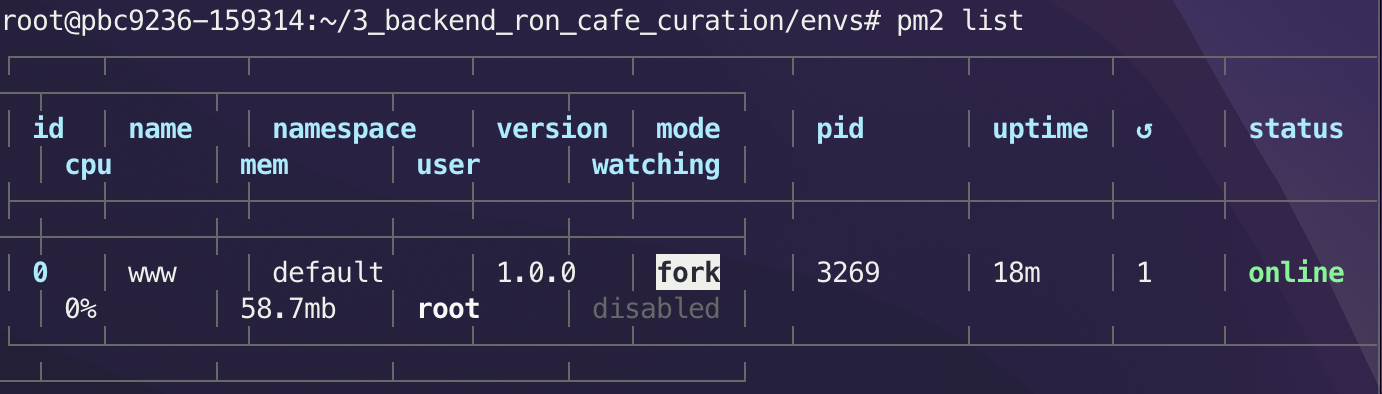 이후 cross-env NODE_ENV=production pm2 start src/bin/www.js 명령 스크립트를 실행해 서버가 정상적으로 실행된 것을 확인했습니다.