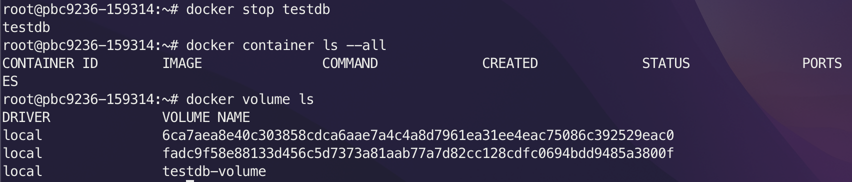 이 testdb 컨테이너를 중지하면, 완전히 --rm 옵션으로 인해 컨테이너가 삭제되지만, volume은 여전히 남아있음을 알 수 있습니다.