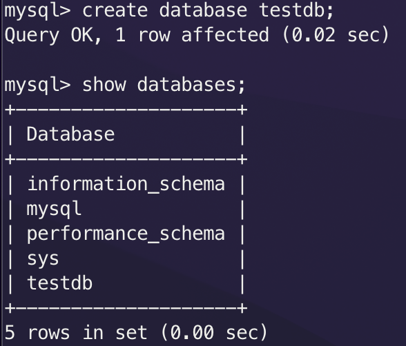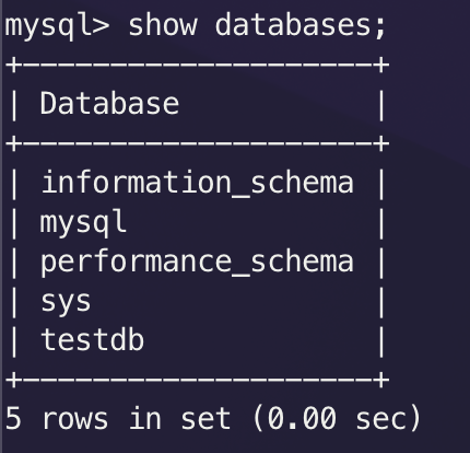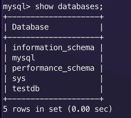 # testdb 데이터베이스가 존재하는지 확인하기 위해 mysql 클라이언트 접속