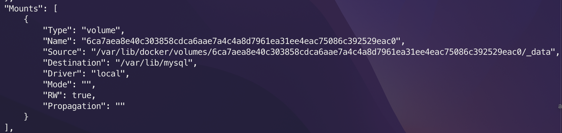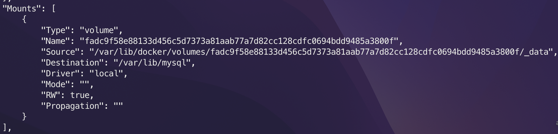 출력된 결과를 보면, docker host 내 /var/lib/docker/volumes/fadc9f58e88133d456c5d7373a81aab77a7d82cc128cdfc0694bdd9485a3800f/_data 디렉토리가 있고, 이 경로의 내용이 /var/lib/mysql로 마운트되어 있음을 알 수 있습니다.