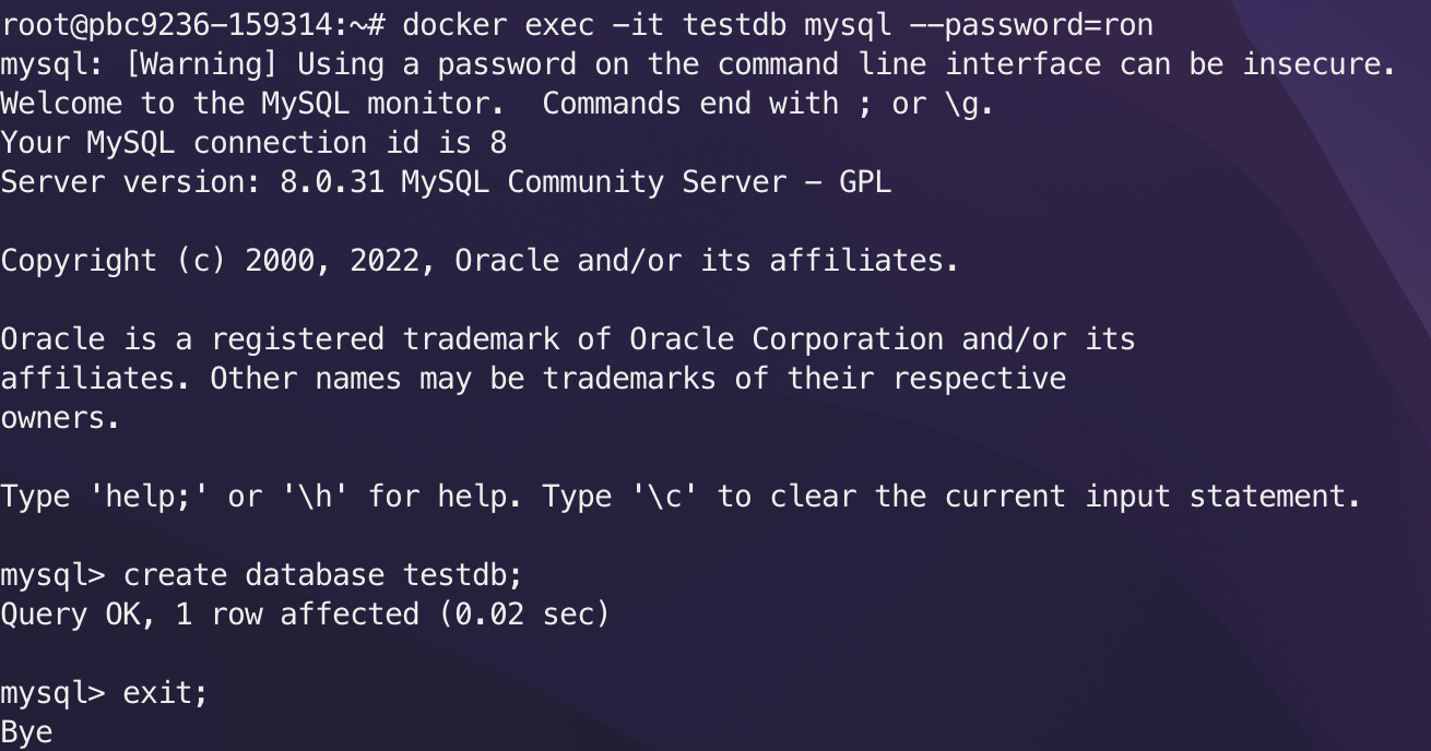 $ docker run --rm -d --name testdb -e MYSQL_ROOT_PASSWORD=ron -v testdb-volume:/var/lib/mysql mysql